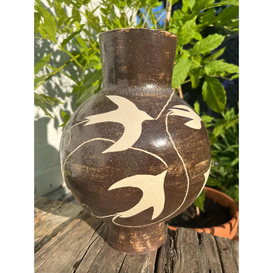 Hand- built glazed red stoneware with swooping swifts pattern and scraffito flight lines.