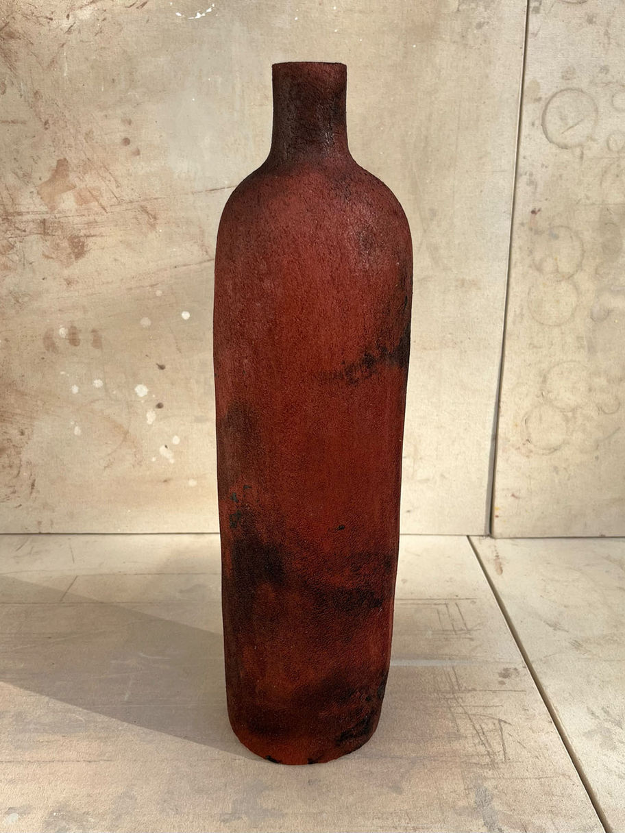 Red stoneware, smoke-fired with pine cones and seaweed.Tall form with narrow foot and darkened surface. Fired with organic materials producing variation and patina.